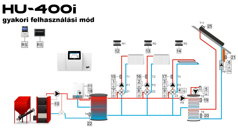 A HU-400i vezérlő egy univerzális berendezés, amely segítségével a hűtés és fűtési rendszer teljes vezérlése megoldható.