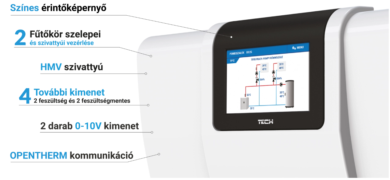 Megújult képességei alkalmassá teszik egy komplex hőközpont irányítására. Ideális megoldást kínál pl. automatikus átváltás levezénylésére, egyidejűleg váltva a hőszivattyú és a egy zónavezérlő rendszer működését HŰTÉS/FŰTÉS üzemmódok között.