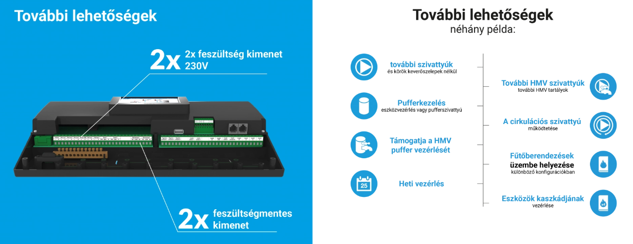 • 2db 230V 50/60Hz kimenet vezérlése különböző üzemmódokban (KF, HMV vagy cirkulációs szivattyú, szobatermosztát, heti program, fűtés igény, stb.), választható hőmérséklet érzékelő érték alapján