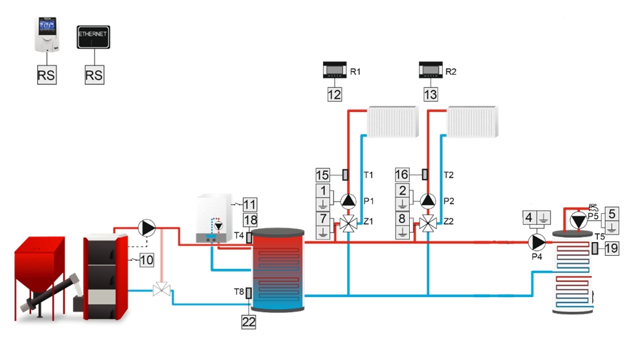 • szilárdtüzelésű kazán visszatérő ágának védelmének biztosítása